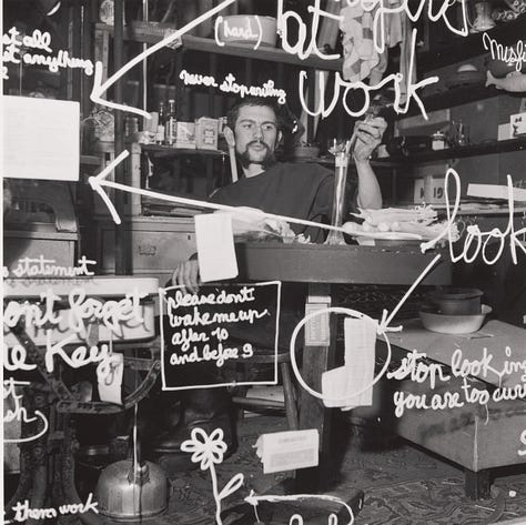 A snippet of her bedside table, the contents of her purse aesthetically splayed out for viewers to pick over, an artfully stacked set of objects that seek to capture the essence of the sculptor. These videos reflect some of the core tenets of Fluxus: little moments of life elevated to the status of ritual and art.