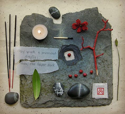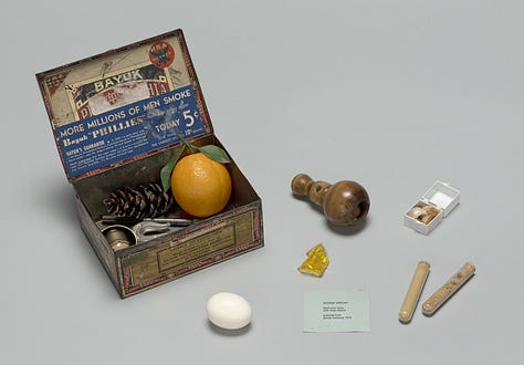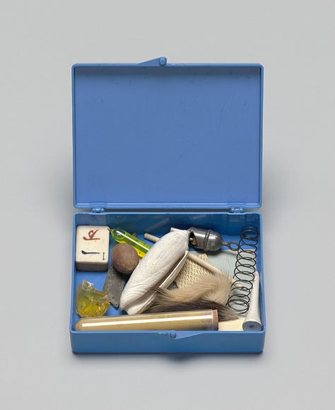 At first glance, it looks like someone emptied the contents of a child’s pockets into a container. Something about the image caused my attention to linger. I have a thing about flat lays and rituals. Clearly there is a deeper context here. Come to find out, I wasn’t being a pretentious asshole, this IS art….Fluxus to be exact.